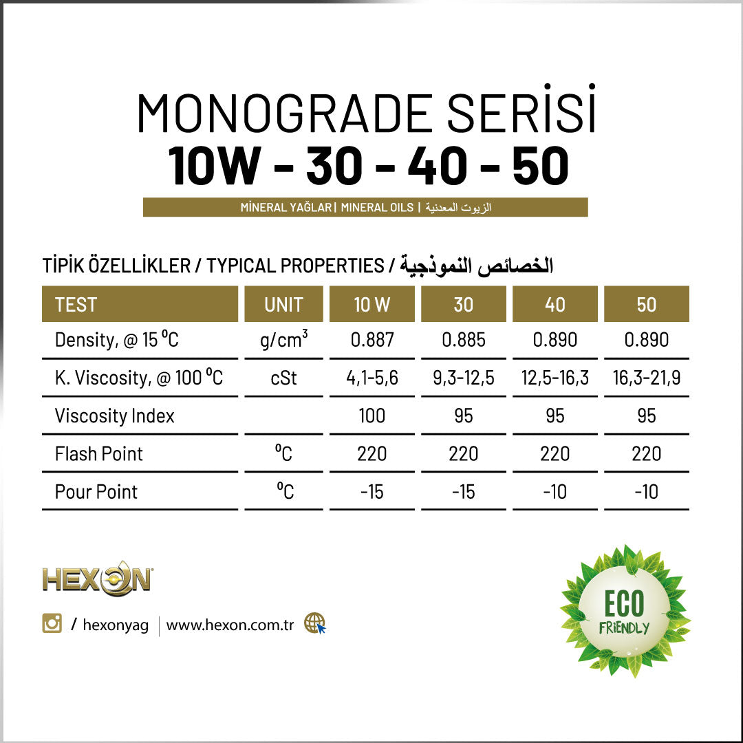 HEXON SAE 10 CC/SC, kaliteli mineral baz yağlar ve dikkatle seçilmiş katkı maddeleriyle formüle edilmiş, oxidasyona dayanıklı, köpürmeyen ve sudan kolay ayrılan ekonomik bir endüstriyel yağdır. API “CC” yağ sınıfı genellikle ağır hizmet tipi dizel motorlar için geliştirilmiş olup, “SC” sınıfı benzinli eski motorlar için uygundur.