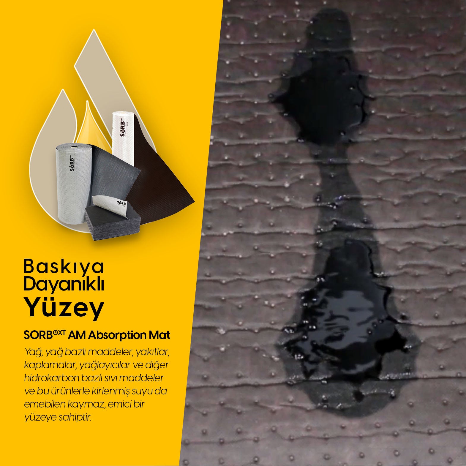 SORB®XT AM Absorption matı; yağ, yağ bazlı maddeler, yakıtlar, kaplamalar, yağlayıcılar ve diğer hidrokarbon bazlı sıvı maddeler için kaymaz, emici bir yüzeye sahiptir.